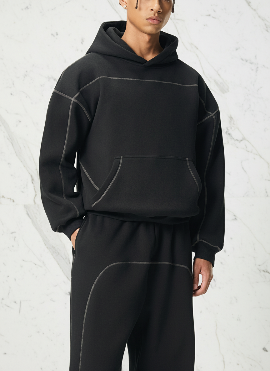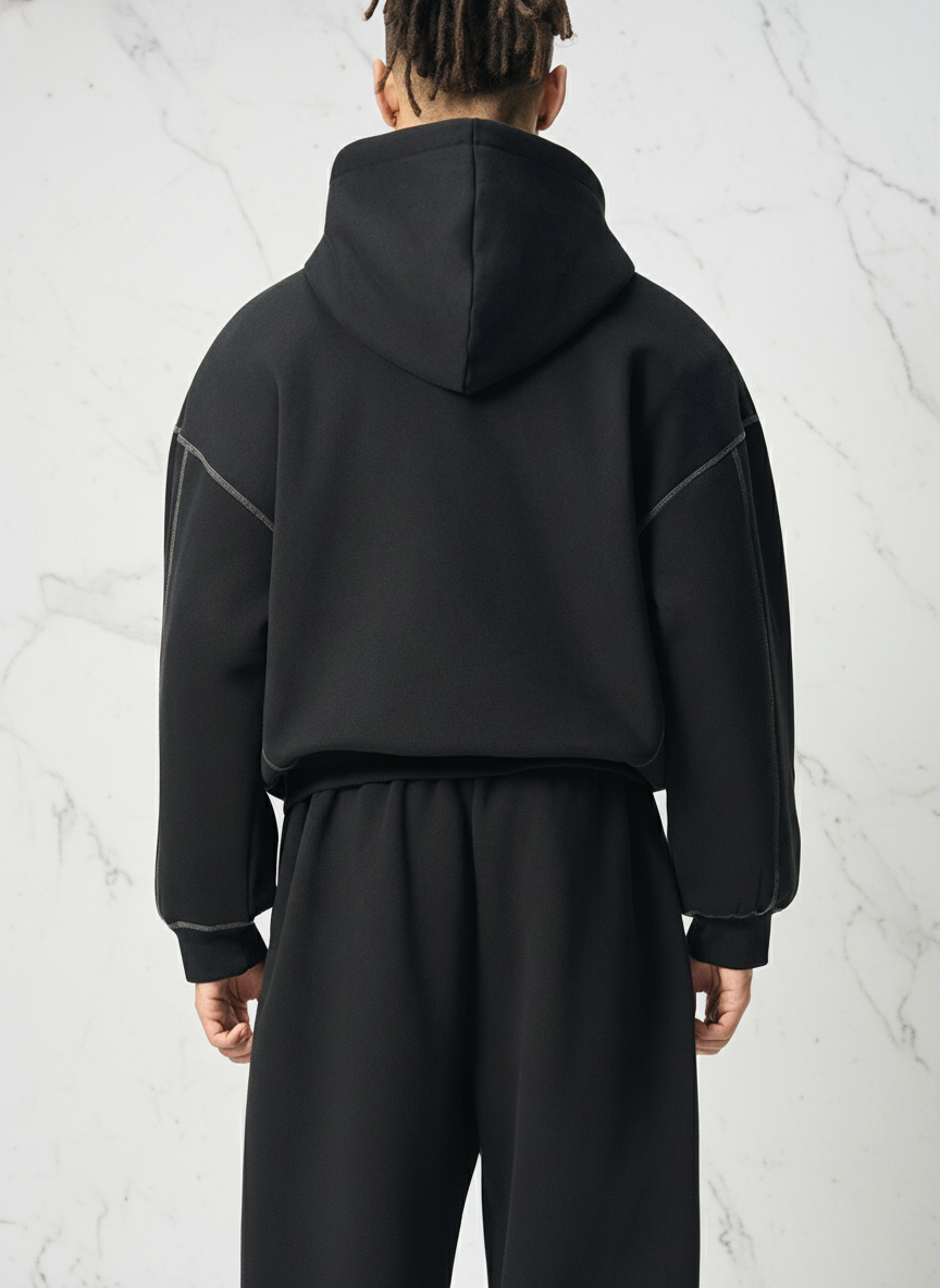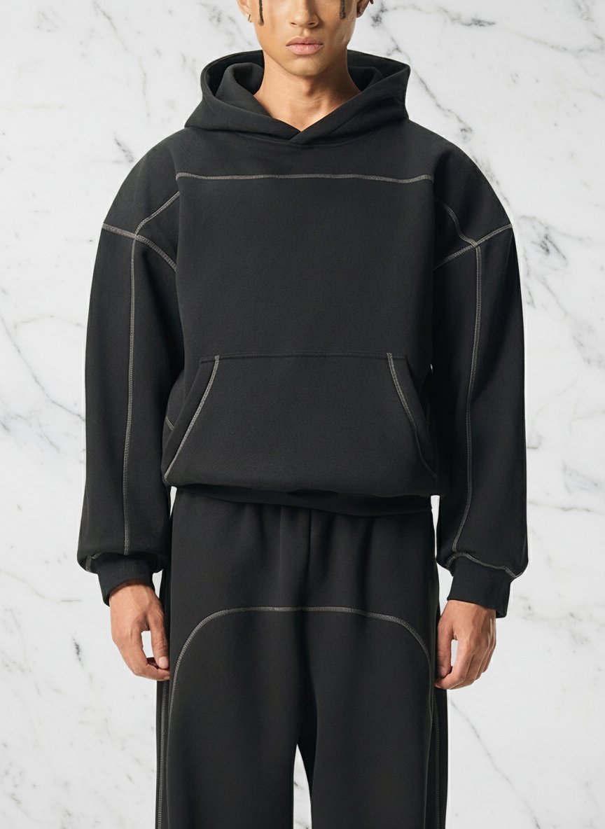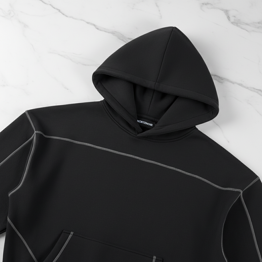 Elevate your streetwear wardrobe with the MorteNoir Contrast-Stitched Boxy Fleece Hoodie. Crafted with distinctive grey contrast stitching throughout and a relaxed oversized fit, this premium hoodie blends edgy aesthetics with supreme comfort.