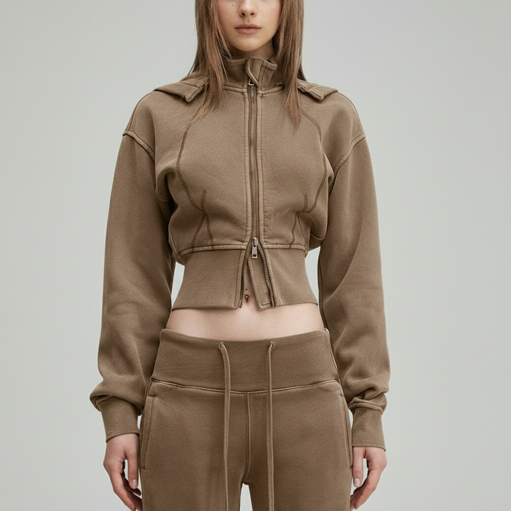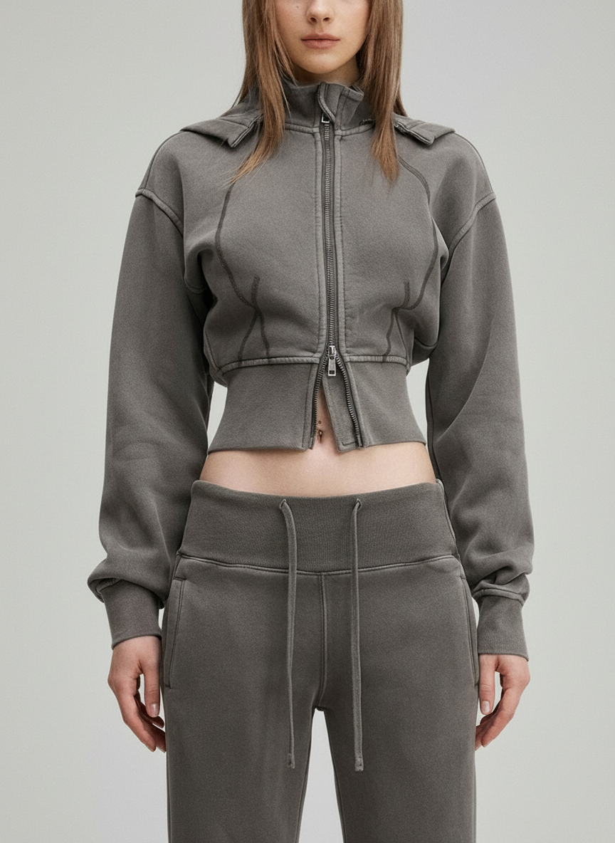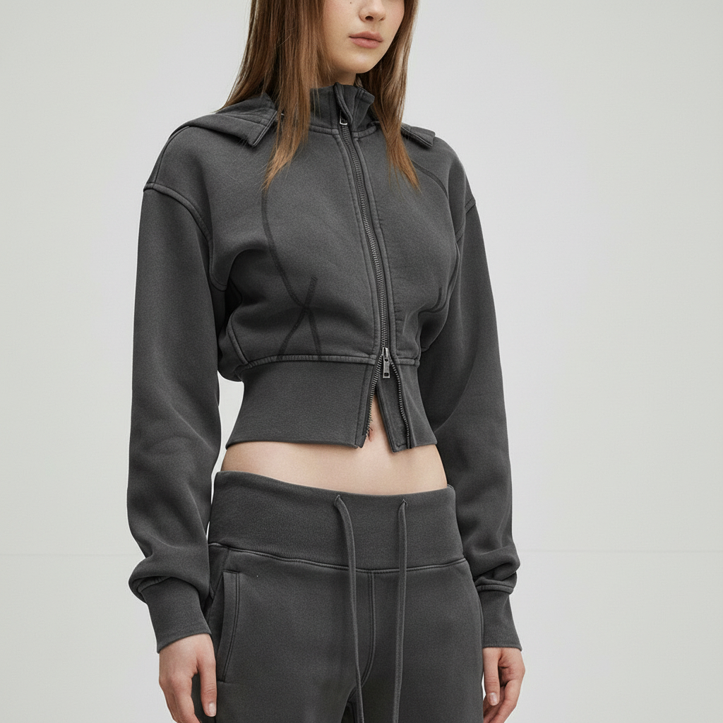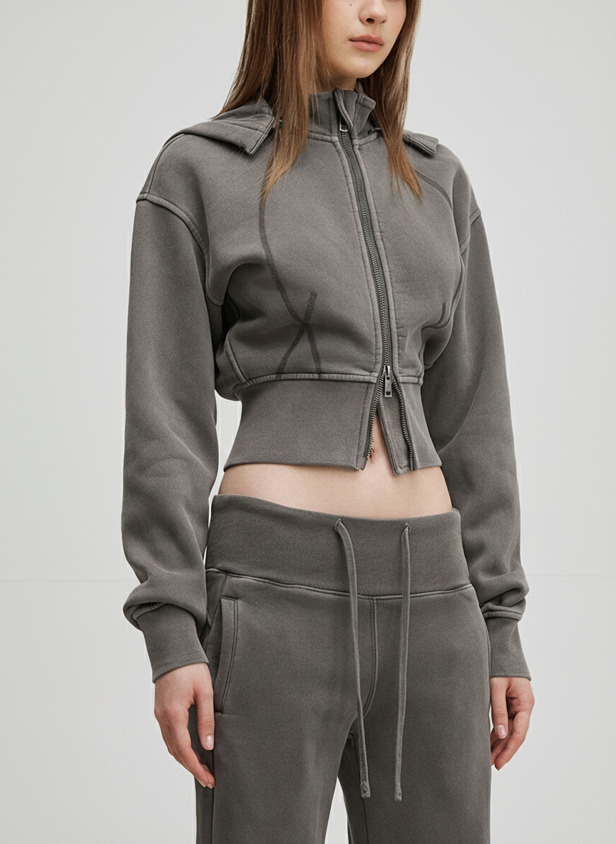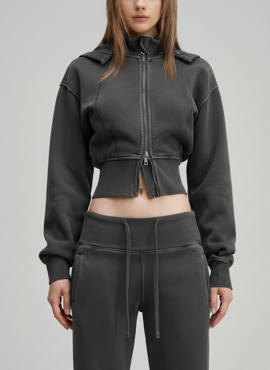 Elevate your streetwear game with this vintage washed cropped fleece hoodie. Crafted for the bold and unapologetic, this premium piece features a distinctive cropped silhouette with a dual-zip design and signature washed finish.