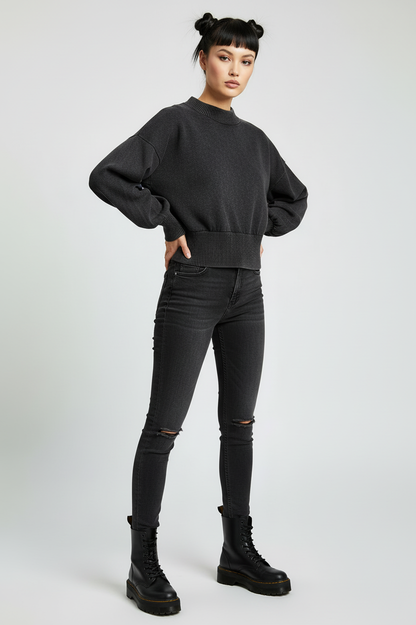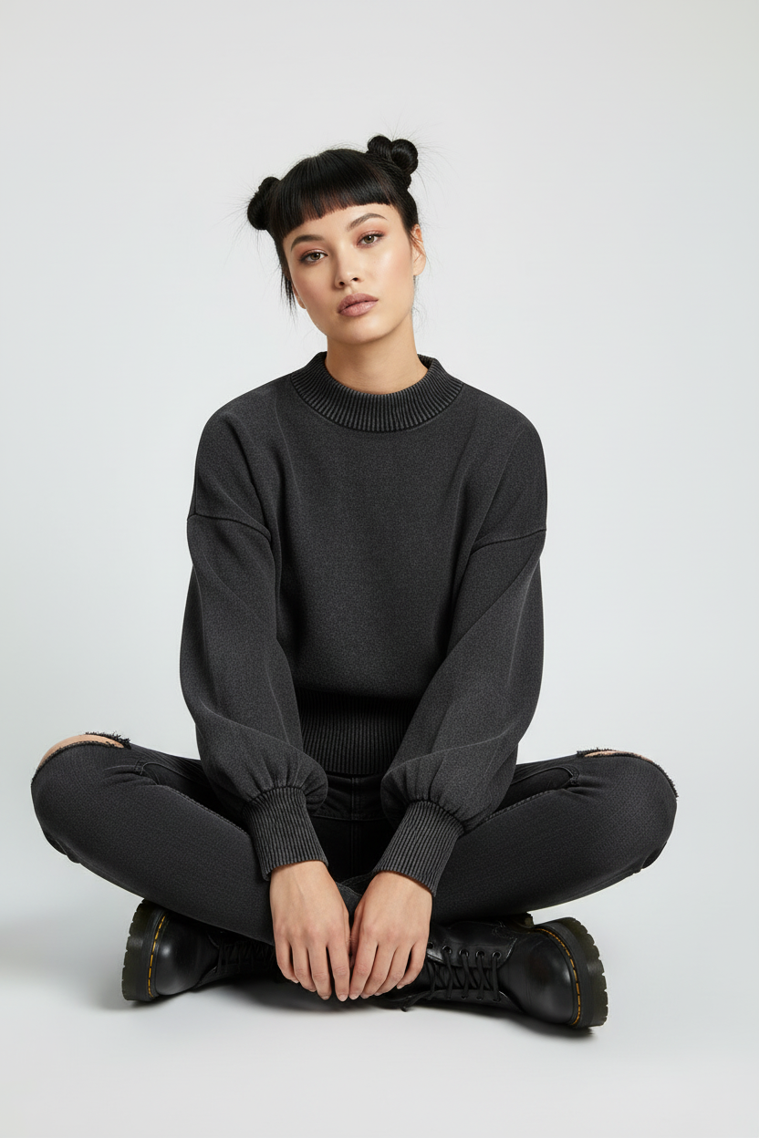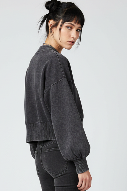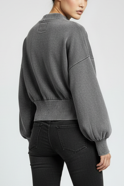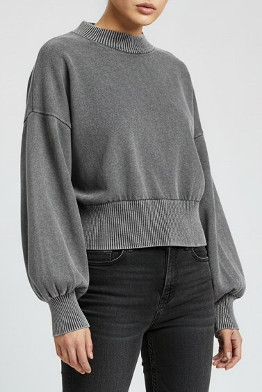 Elevate your streetwear game with this mineral wash cropped sweater. Featuring statement balloon sleeves and ribbed knit detailing, this piece blends minimal luxury with edgy contemporary style. The soft, textured fabric and relaxed cropped fit create an effortlessly cool silhouette that pairs perfectly with high-waisted bottoms. Made-to-order for conscious fashion lovers.
