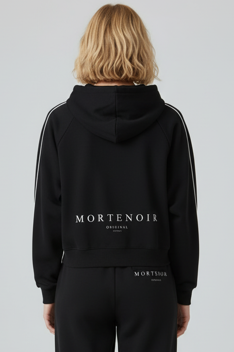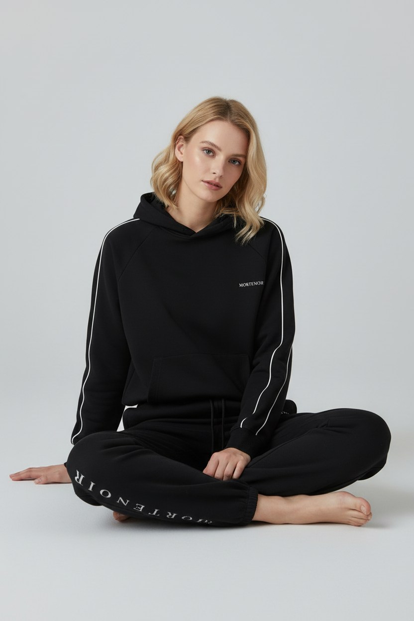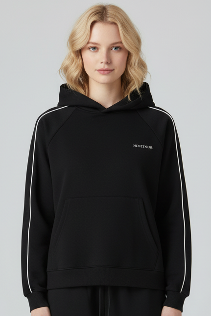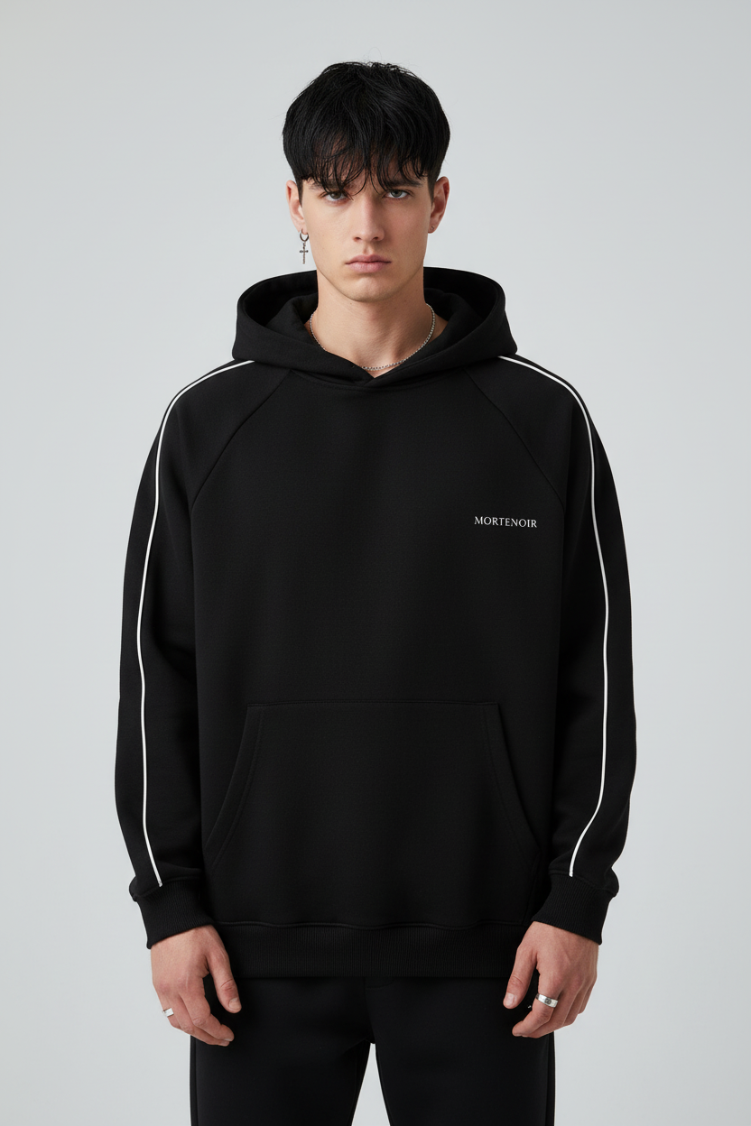 Minimal luxury meets street edge. This premium raglan hoodie features striking white contrast piping along the sleeves, creating a bold graphic line against the deep black base. Crafted for those who demand quality and understated statement pieces.