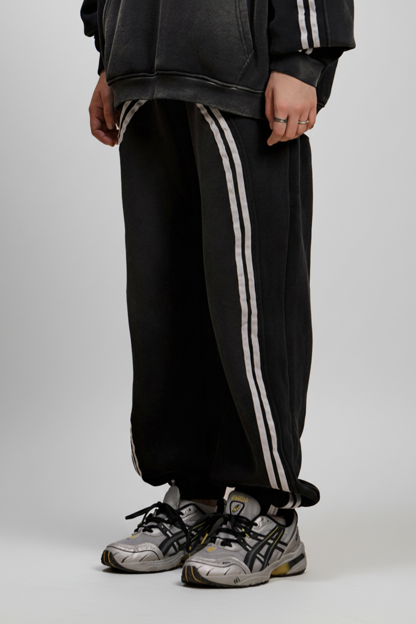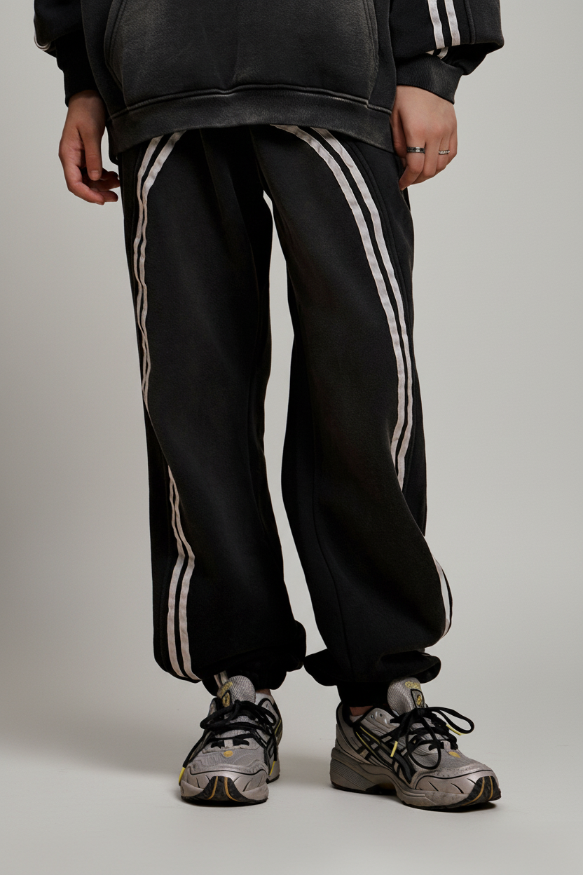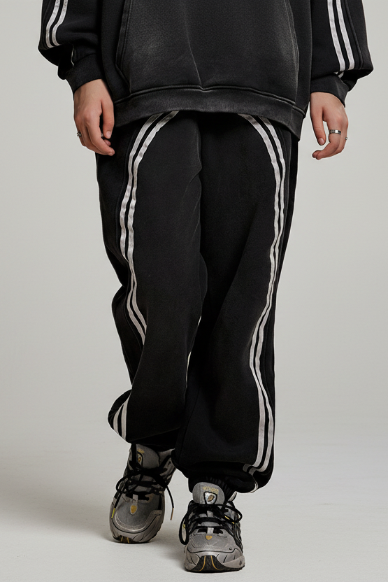 Elevated comfort meets street-ready style. These fleece joggers feature contrast tape detailing down the sides, a relaxed fit, and a sun-faded black finish that adds depth and character.