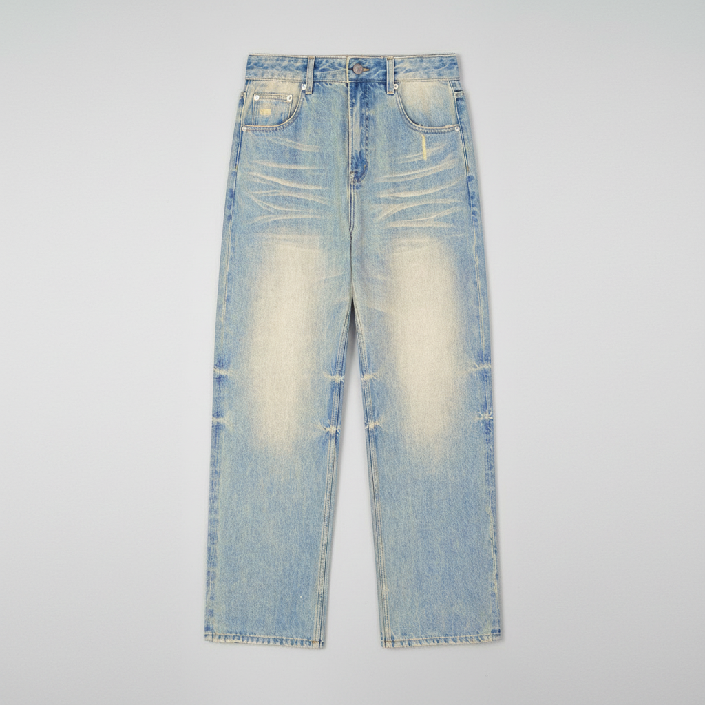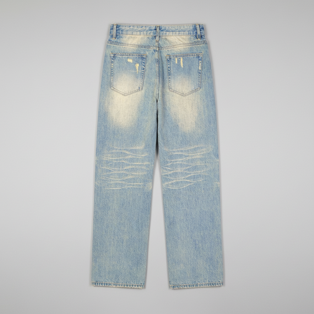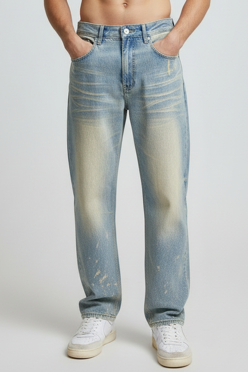Make a statement in these light blue straight-leg jeans featuring an artistic cream and beige paint splatter effect. Crafted with a relaxed fit and clean minimalist design, these jeans blend streetwear edge with premium denim quality. The unique fade pattern ensures no two pairs are exactly alike.