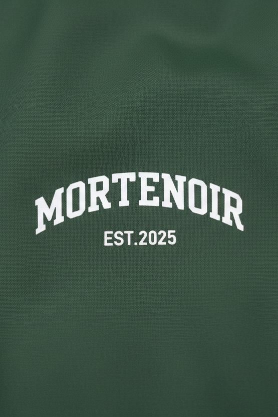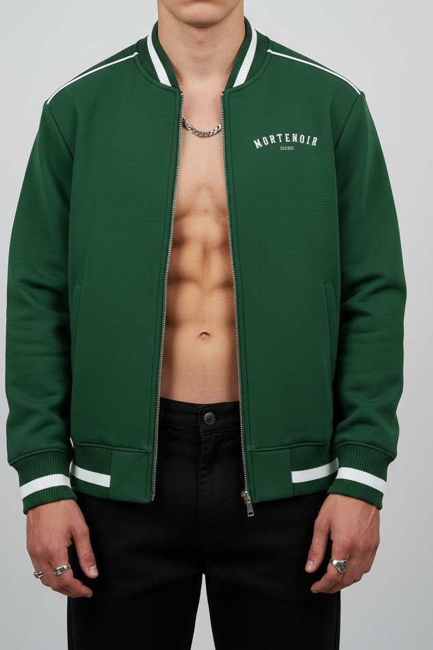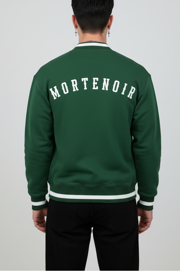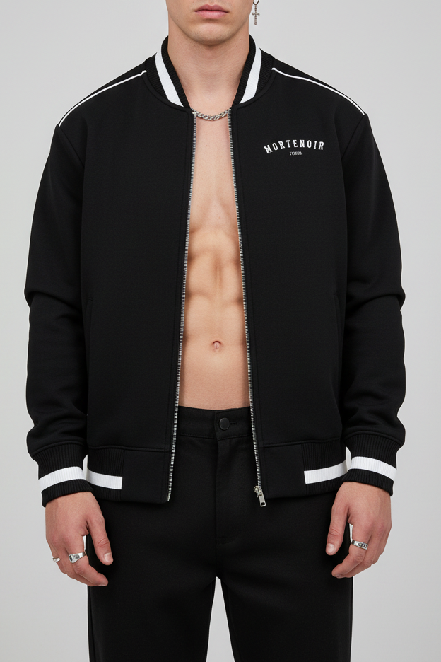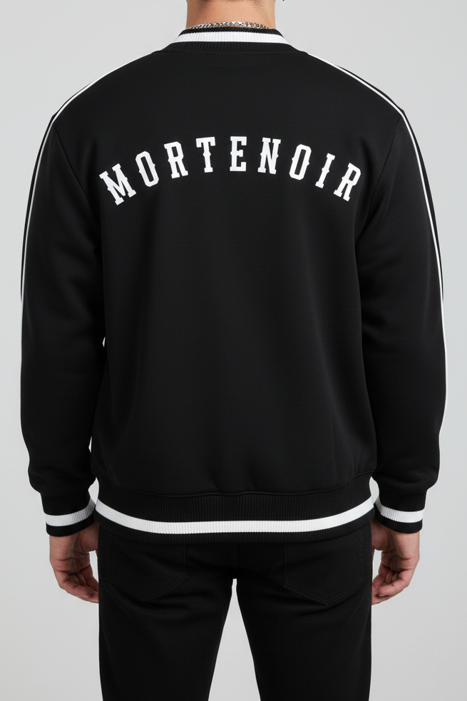 Elevate your dark streetwear aesthetic with this premium bomber jacket featuring curved MORTENOIR collegiate lettering across the back with EST.2025 chest branding. Designed with classic varsity-inspired details including contrast ribbed collar, cuffs, and hem with stripe accents, white shoulder piping, full front zipper, and side pockets. The regular fit delivers authentic streetwear style with a gothic edge, perfect for layering or making a statement.