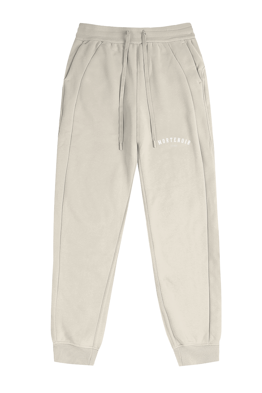 Elevate your dark streetwear wardrobe with these premium joggers featuring curved MORTENOIR collegiate lettering with EST.2025 branding on the thigh. Designed for comfort and style with an elastic waistband, adjustable drawstring, functional side pockets, and elastic ankle cuffs. The relaxed athletic fit delivers effortless everyday wear with a gothic edge, perfect for layering or solo styling.