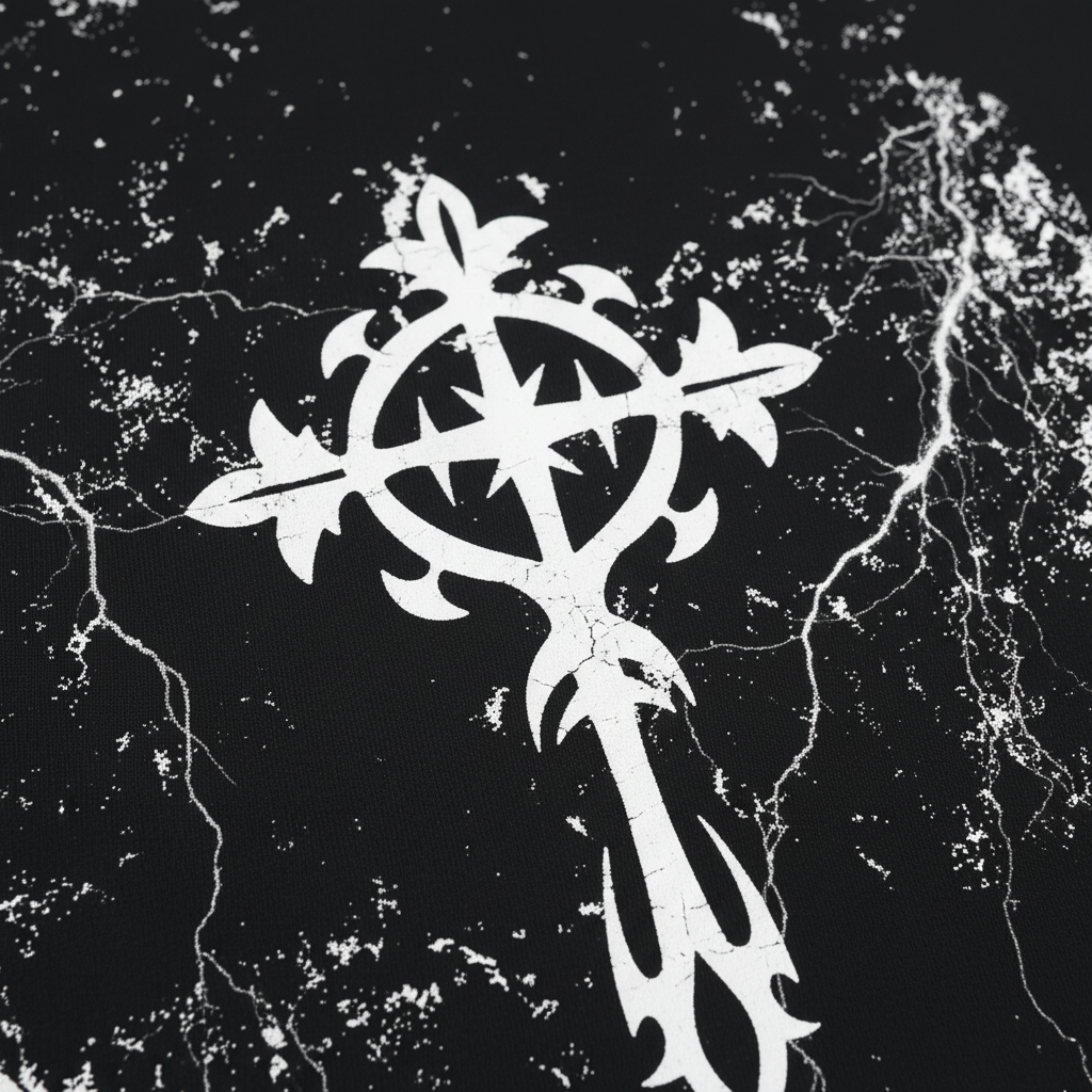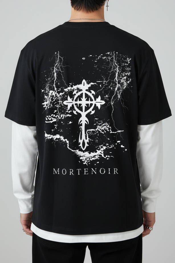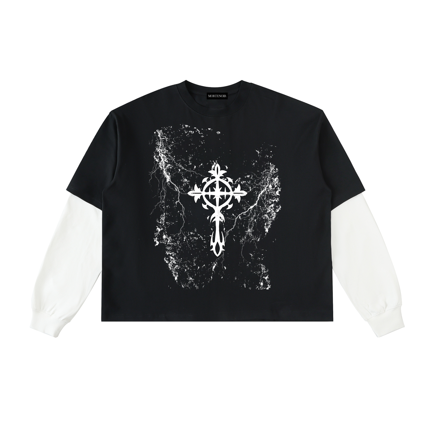 Premium layered contrast sleeve cotton t-shirt featuring a bold distressed ornate cross print with lightning effects. This oversized boxy-fit piece combines a black tee body with white long sleeves for a signature layered look. Heavy distressed crackle texture and ornate cross detailing create an edgy, dark aesthetic perfect for streetwear enthusiasts. Made-to-order with premium cotton construction for superior comfort and durability.